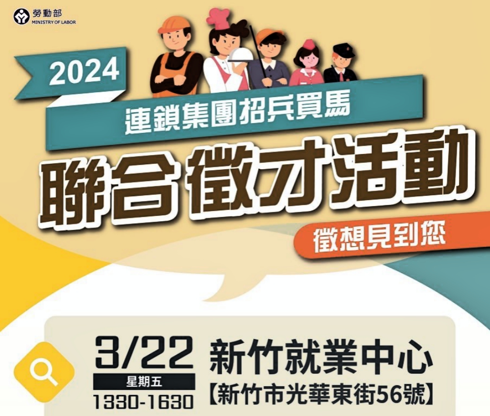 為協助新竹地區知名連鎖企業補實人力,勞動部勞動力發展署桃竹苗分署新竹就業中心將於3月22日(星期五) 下午1時30分至4時30分,在該中心(新竹市光華東街56號)辦理「2024連鎖集團招兵買馬-徵想見到您」聯合徵才活動,邀請共7家連鎖企業共同搶人才。
