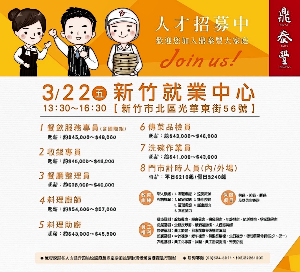 參與廠商有鼎泰豐、米塔、寶雅、全聯、香繼光、大魯閣及愛買共7家釋出近400個職缺,其中,鼎泰豐與新竹就業中心合作專案招募,現場規劃企業介紹專區及現場面試,邀請新竹店主管及人資主管出席,開出包含餐飲服務專員、收銀專員、料理廚師、傳菜品檢員、內(外)場服務人員等125個職缺,薪資最高可達57K,而餐飲服務專員這次釋出50個職缺最多,想投身鼎泰豐工作並了解工作內容的民眾可把握此次直接洽談的機會。