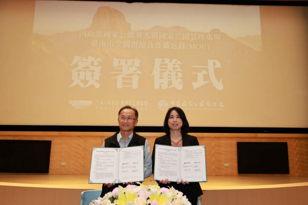 圖說:雪霸國家公園管理處為增進公私部門的合作交流、深化生態保育資源並推廣環境教育,在汶水遊客中心與臺南市立圖書館新總館正式簽署合作備忘錄,合作備忘錄由雪霸處林文和處長及南市圖楊馥菱館長代表簽署。(圖/雪霸處提供)