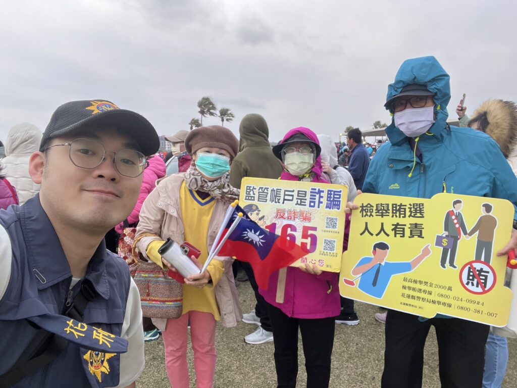 偵查隊員警為強化民眾反詐意識,與縣長徐榛蔚、立委傅崐萁共同向民眾實施反詐騙宣導,提醒民眾詐騙手法層出不窮,若疑似接到詐騙的電話、訊息等,請先冷靜思考多方查證,以避免受騙;由於選舉將屆,員警針對反賄選相關資訊告知民眾,一同淨化選舉風氣,交通組員警則呼籲民眾如有飲酒情形切勿駕車,以維護自身及他人的用路安全。