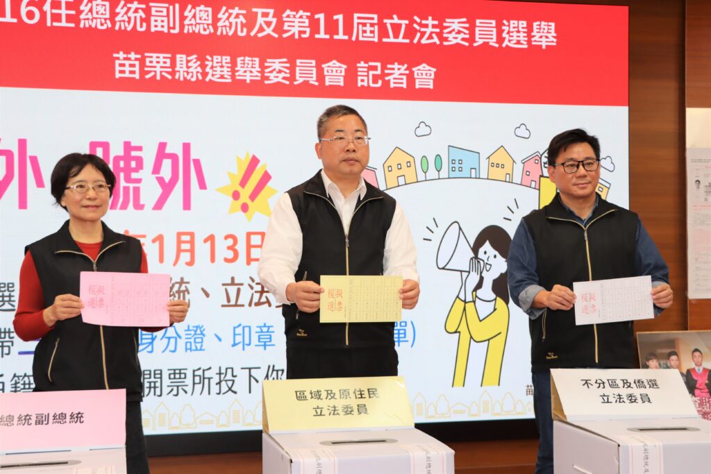 苗栗縣選委會2日上午在縣府201會議室召開記者會,說明第16任總統副總統及第11屆立法委員選舉作業,並由代主委陳斌山、總幹事呂岸霖、副總幹事曾雪花展示總統副總統、區域立委、全國不分區的模擬選票。