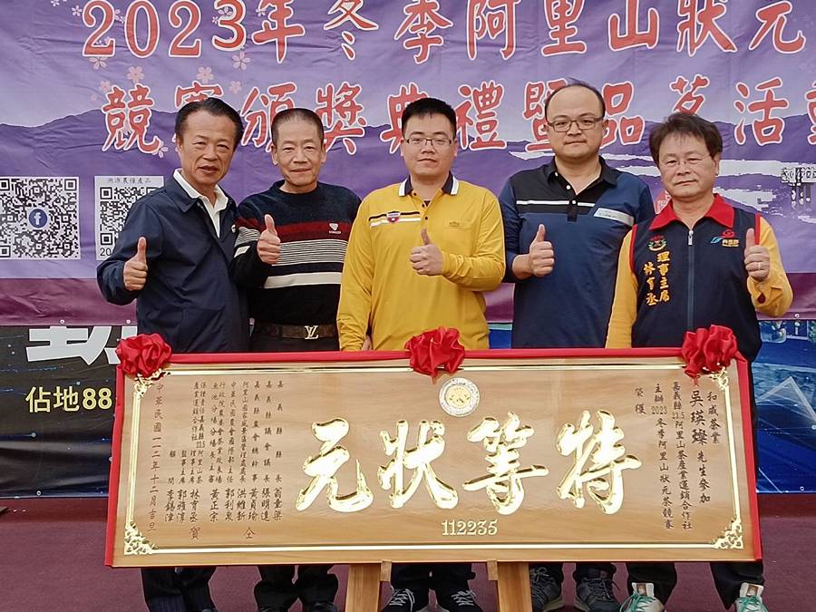 該合作社理事林育丞指出,112年23.5阿里山茶產業運銷合作社冬季阿里山狀元茶競賽,評比結果,「特等狀元獎」由和成茶業吳瑛璨贏得;頭等獎為瑞茗祥茶葉陳怡伶等4名,5星獎為祥元茗茶有限公司盧瑞祥等12名,3星獎為王仁利等30名。