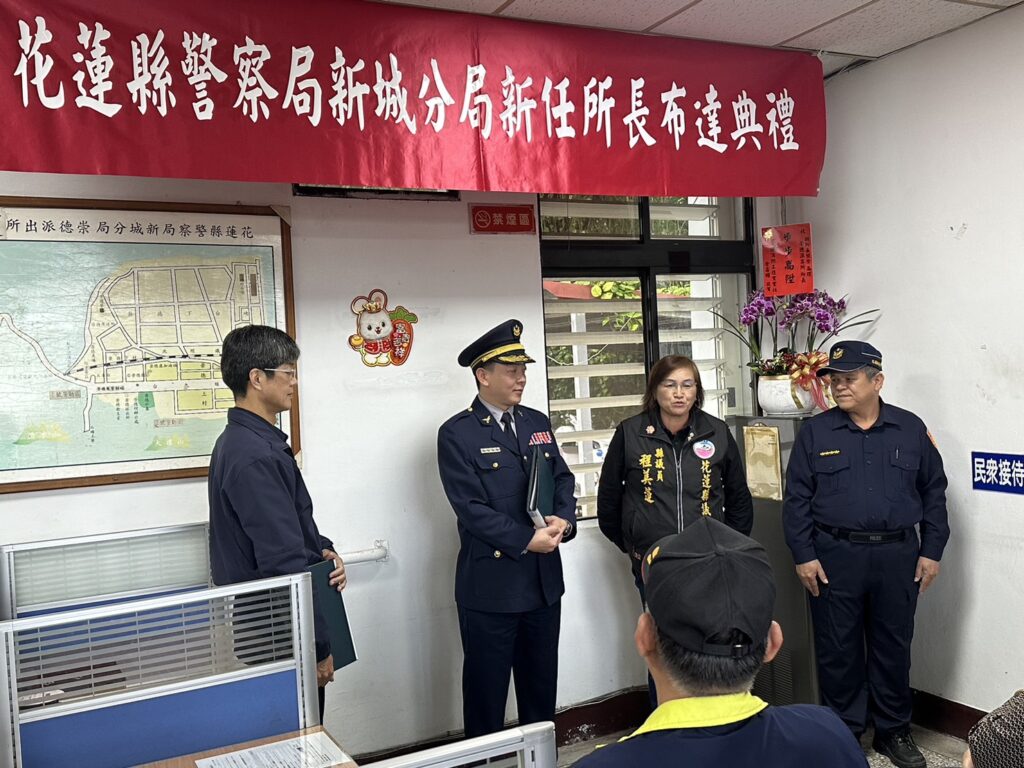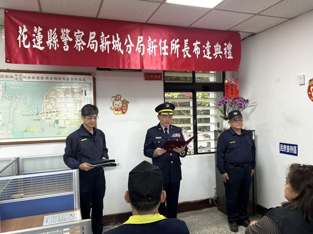 新城警分局昨2日舉行崇德派出所新任所長布達典禮,原崇德派出所所長林金章自願退休,遺缺由原任巡佐代理副所長胡俊榮接任,布達典禮由分局長吳思翰主持,典禮簡單隆重,議員程美蓮及秀林鄉代表主席駱燕玲、代表白靜文、白秀娟、白世義、夏義松、游青龍、崇德村村長李慧齡、崇德國小校長謝易成、秀林鄉公所機要秘書黃勤聰、警察之友會副主任簡瑀萱等貴賓參加。