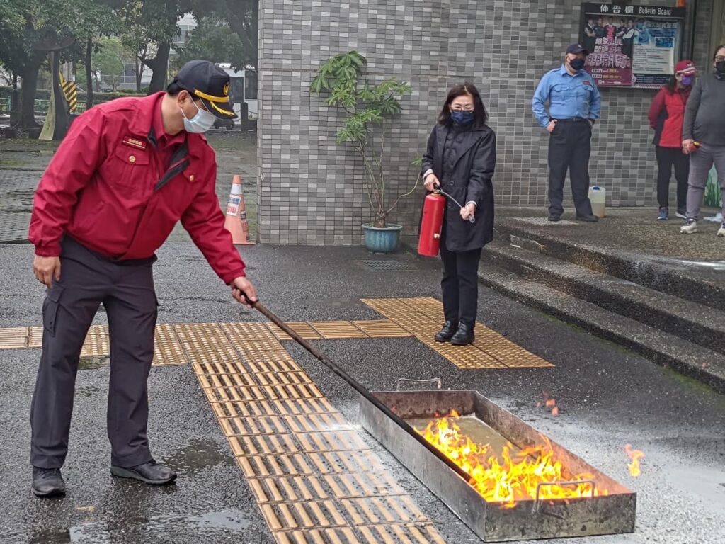 火災初期的黃金30秒至關重要。藉由油盤模擬起火的方式,讓受訓人員有機會操作滅火器進行滅火。滅火器的操作口訣中的拉(插梢)→瞄(火源根部)→壓(把柄)→掃(向火源左右噴灑),透過實體體驗,讓每一位參與者都能在危急時刻保持冷靜並有效應對。操作時,離火源1到3公尺以上並且位於上風處,才可以安全的進行滅火任務。