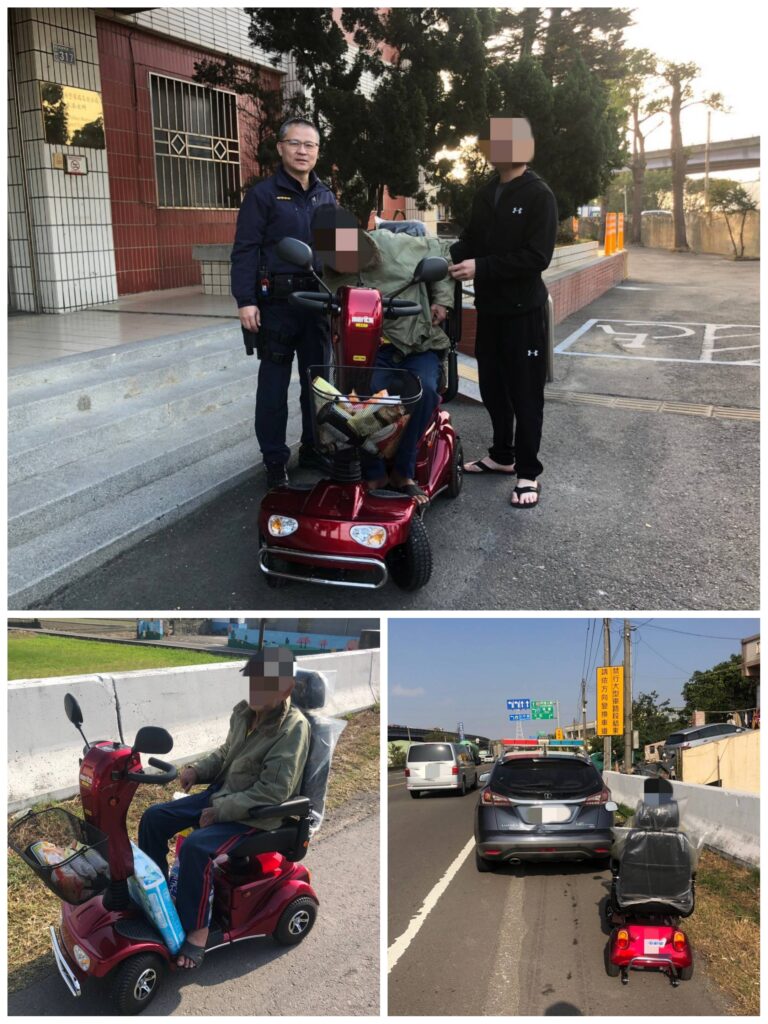臺中市政府警察局烏日分局麗水派出所獲報,立即派遣員警到場處理,發現許翁一臉徬徨無助使用僅剩電力努力想下橋。員警擔心許翁安危,先以警車在他後面警戒護送他至橋下,再將他載回派出所稍作休息,之後員警再趕回現場將代步車推回派出所。 然而老翁只記得自己姓名,但住家地址完全忘記,所幸副所長蕭銀柏眼尖發現代步車車型序號,趕緊聯繫店家,順利聯繫上老翁的兒子。 經了解,這台電動代步車是兒子盡孝心購買給老父親,老翁相當開心獲得新車,想說天氣不錯,騎著新車外出購物,沒想到迷路,愈騎愈遠,不知不覺已經騎到台中龍井區。家屬見老翁平安歸來,頻頻感謝員警的協助。 臺中市政府警察局烏日分局呼籲,家中如有高齡長者或行動不便人士,要隨時關懷他們的生活起居,並叮嚀外出要注意交通安全,特別是有使用代步車者,在出門前也要注意電力是否充足,藉以提升年長者的用路安全品質,共同維護大家的行車安全。