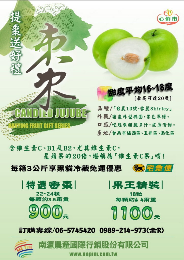 保健意識抬頭,健康又美味的當季果品、農漁特產伴手禮盒,成為許多民眾挑選年節禮盒的首選。臺南蜜棗高品質碩大的淺綠色圓潤果實,猶如青蘋果,口感清甜甘脆,產季適逢年節新鮮上市,不僅是高級國產水果禮盒送禮首選,也是外銷日本的優質農產品。