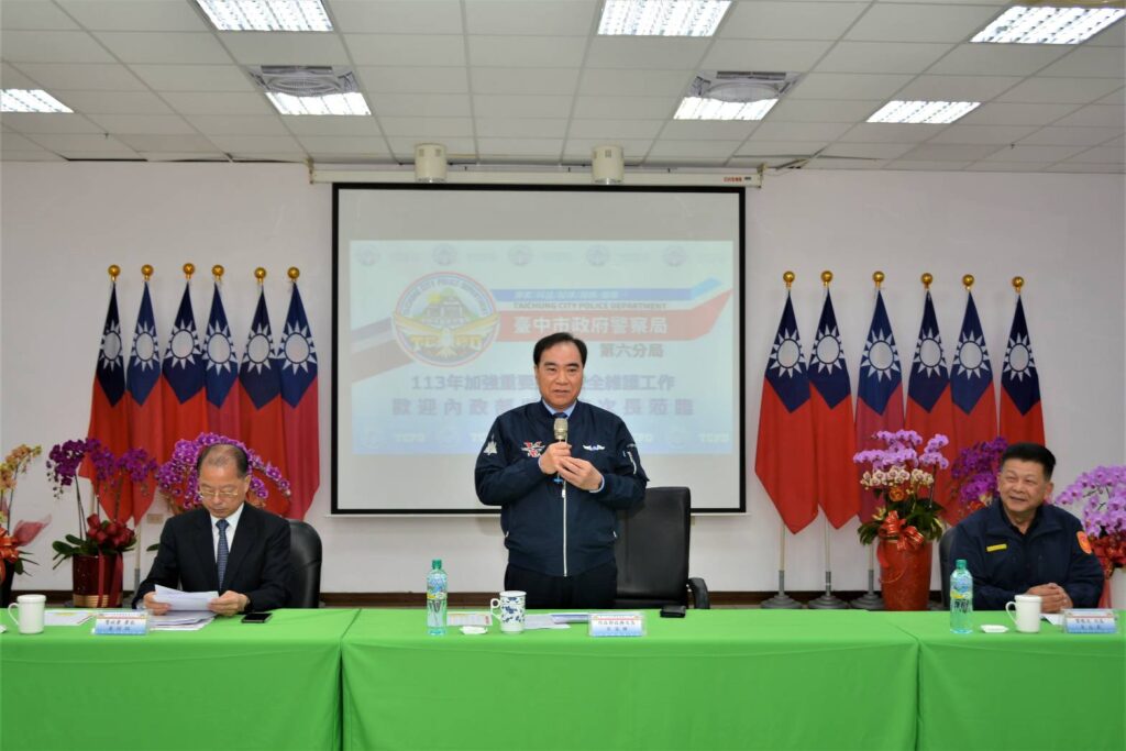 內政部政務次長吳容輝為體恤警察同仁辛勞,於113年2月1日9時偕同警政署署長黃明昭、臺中市政府警察局李局長文章,蒞臨臺中市政府警察局第六分局慰勉警察同仁執行「113年加強重要節日安全維護工作」之辛勞及無私奉獻的民力。春節連續假期,是民眾返鄉、出遊及跟家人團聚的重要節日,也是警察單位犧牲假期投入警力最多的時刻,警察同仁堅守崗位維護轄區治安及交通,辛勞的執勤就是要讓民眾歡度一個平安、愉快的春節。