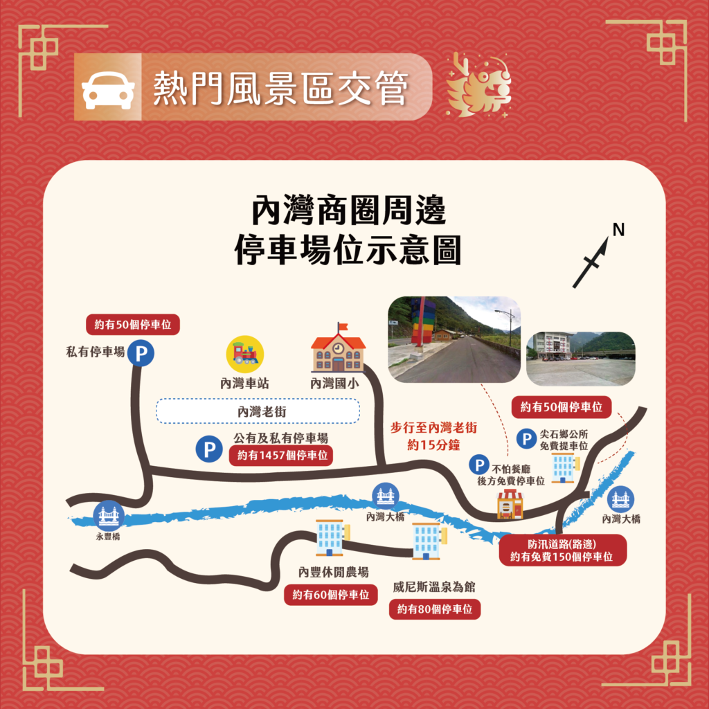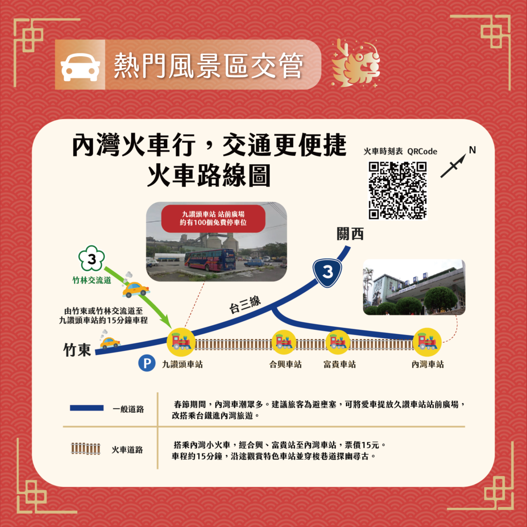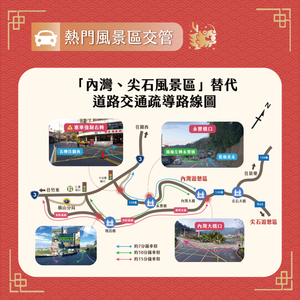 新竹縣政府警察局為因應113年2月8日(星期四,除夕前一日)至2月14日(星期三,初五)為期7天春節連續假期,動員所有警、民力執行交通指揮疏導縣內關西鎮六福村主題遊樂區、竹東北埔老街風景區、內灣老街風景區及尖石風景區,以達成「交通順心,人車平安」,藉以提供民眾春節連續假期之交通安全與順暢;其中疏導管制路段重點如下: