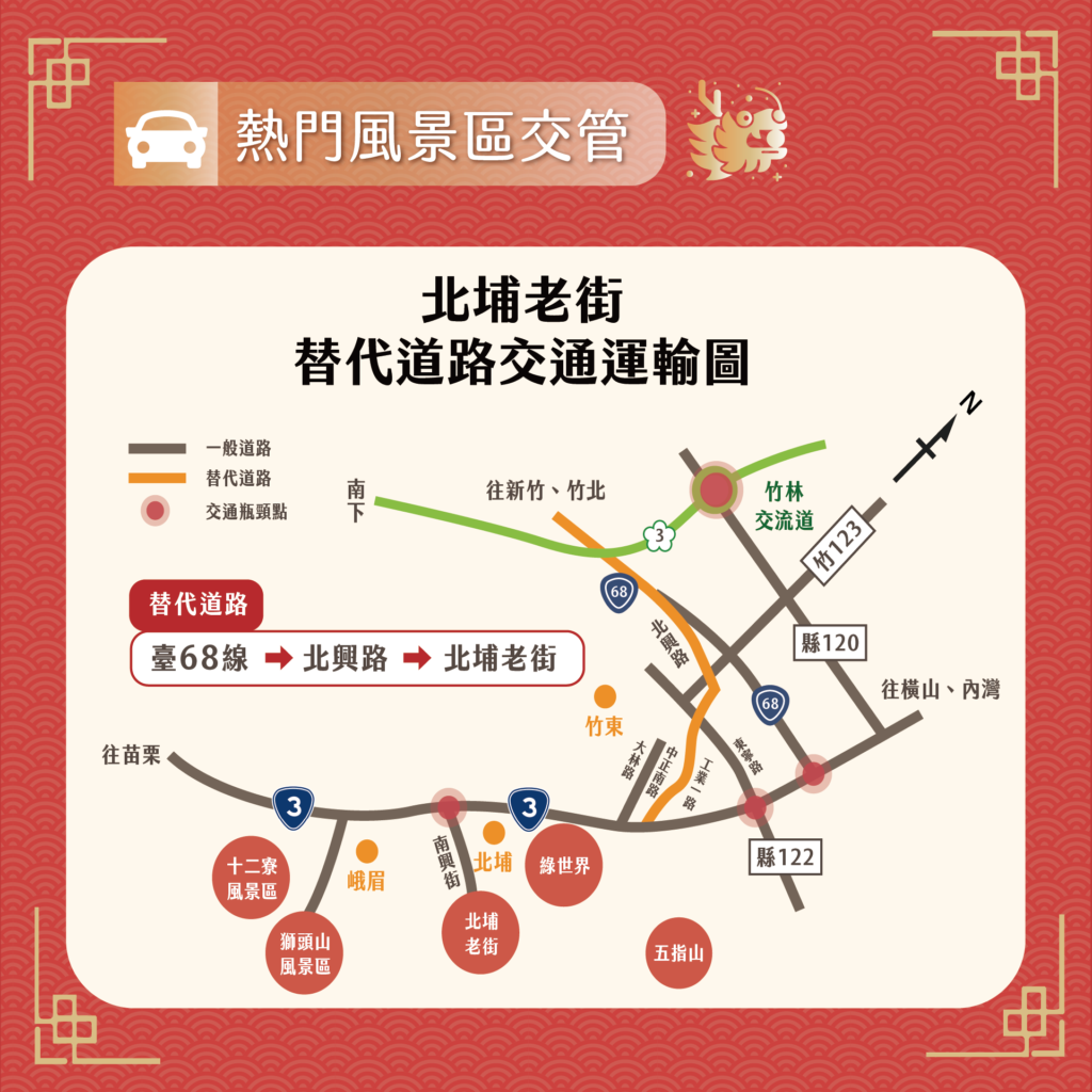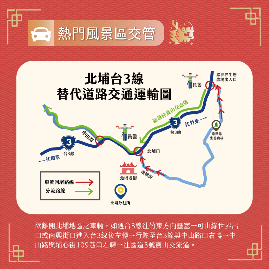 三、 北埔台3線往竹東方向替代道路(離開北埔地區,台3線往竹東方向壅塞): 由綠世界或出口或南興街口進入台3線後左轉→台3線與中山路口右轉→中山路與埔新街109巷口右轉→往國道3號寶山交流道。