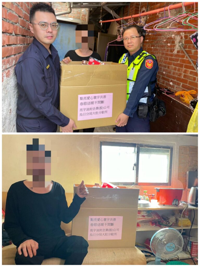 【記者蔡澤汝/台中報導】 農曆新年即將來臨,社會上有許多弱勢家庭,沒有機會吃上一頓年夜飯,臺中市政府警察局烏日分局大肚分駐所結合轄內地方企業亮宇油封企業公司共同攜手「點亮愛心寒冬送暖」,趁年前分送慰問金及愛心物資給轄內的弱勢家庭,讓他們在寒冬之際也能夠感受到社會溫暖過個好年。