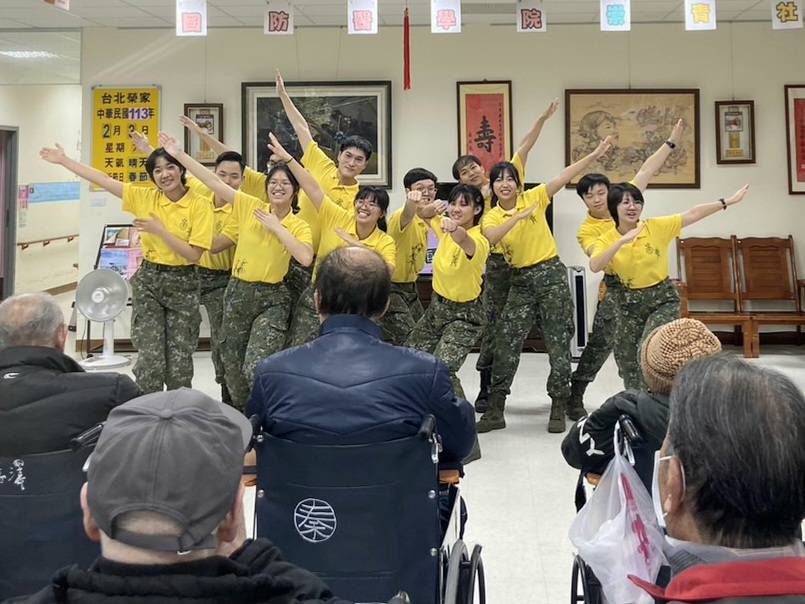 【記者邵祥輝/新北報導】國防醫學院崇青社學生昨(3)日為三峽台北榮家住民帶來了精彩的勁歌熱舞表演,尤其是他們身著整齊的迷彩軍服唱歌答數,更是吸引了長輩們的目光,成為表演內容的活招牌。