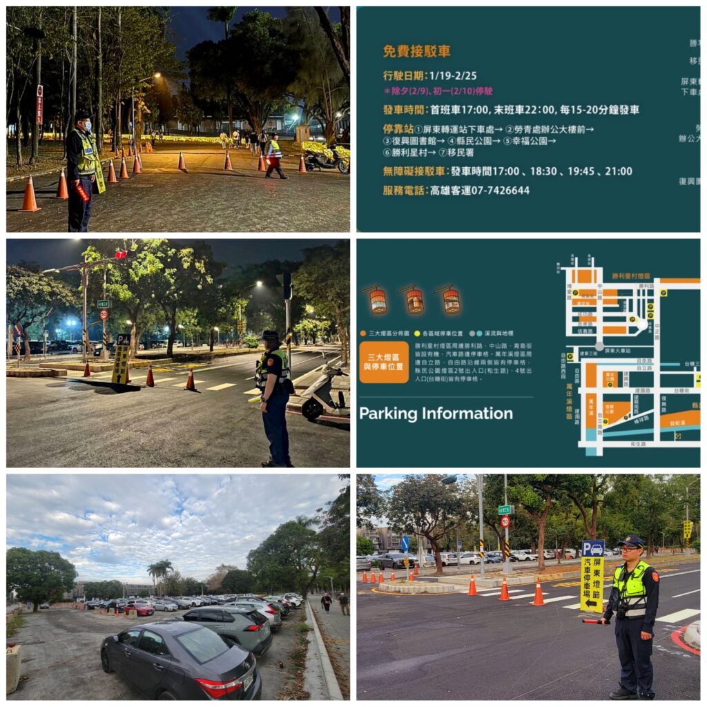 屏東警分局針對2024屏東燈節活動,相關宣導重點如下:1、 免費接駁車:自1月19日至2月25日(除夕及初一以外每日行駛)每日17至22時。首班車17時自屏東轉運站出發,末班車則為22時,約10至20分鐘一班車,請民眾善用,輕鬆暢遊。2、 停車場:(1) 縣民公園原工業六路入口處停車場因施工,故不對外開放;新規劃的停車位置為台糖三街路段旁空地,請民眾注意指引牌面,減速慢行。(2) 復興公園及萬年公園停車空間有限,主要位於棒球路、自立南路側及建國路側等。(3) 勝利星村停車場位於博愛路與青島街口及勝利新城旁空翔區,如滿位,將實施路口管制,以避免車輛停等隊伍造成交通回堵,請民眾配合。 屏東警分局長蔡培元呼籲,2024屏東燈節的燈飾造型精美,讓人不免駐足留影,但請大家多注意腳下燈飾位置,保持適當距離,以免造成燈具損壞。另年節期間屏東警分局同仁不分晝夜堅守崗位,持續加強各燈區安維與疏導,請大家多給予執勤的警察同仁支持鼓勵。