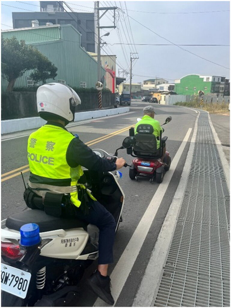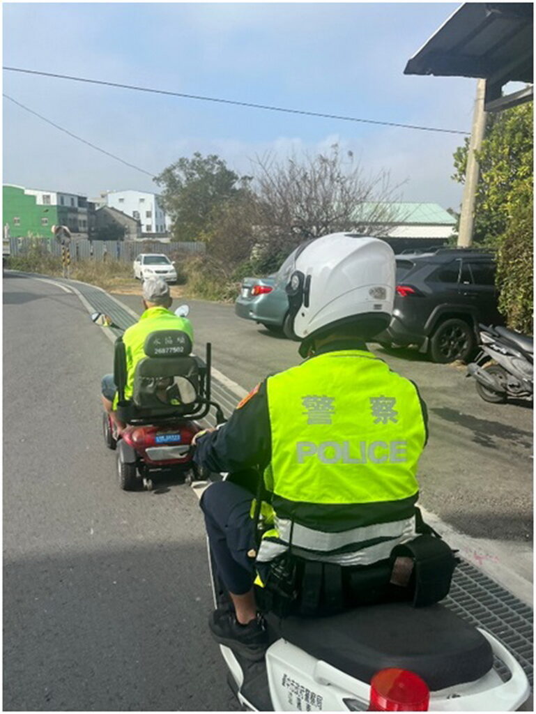 一名老翁駕駛電動代步車行駛在臺中市外埔區,未料在半途中疑似身體不適,連人帶車險些栽入路旁水溝,幸好正在一旁執勤的大甲分局外埔分駐所員警及熱心民眾見狀後,立即協助將老翁扶起,並由員警一路護送老翁返家,最後老翁平安抵達住居所,並對協助的員警表達感謝之意。