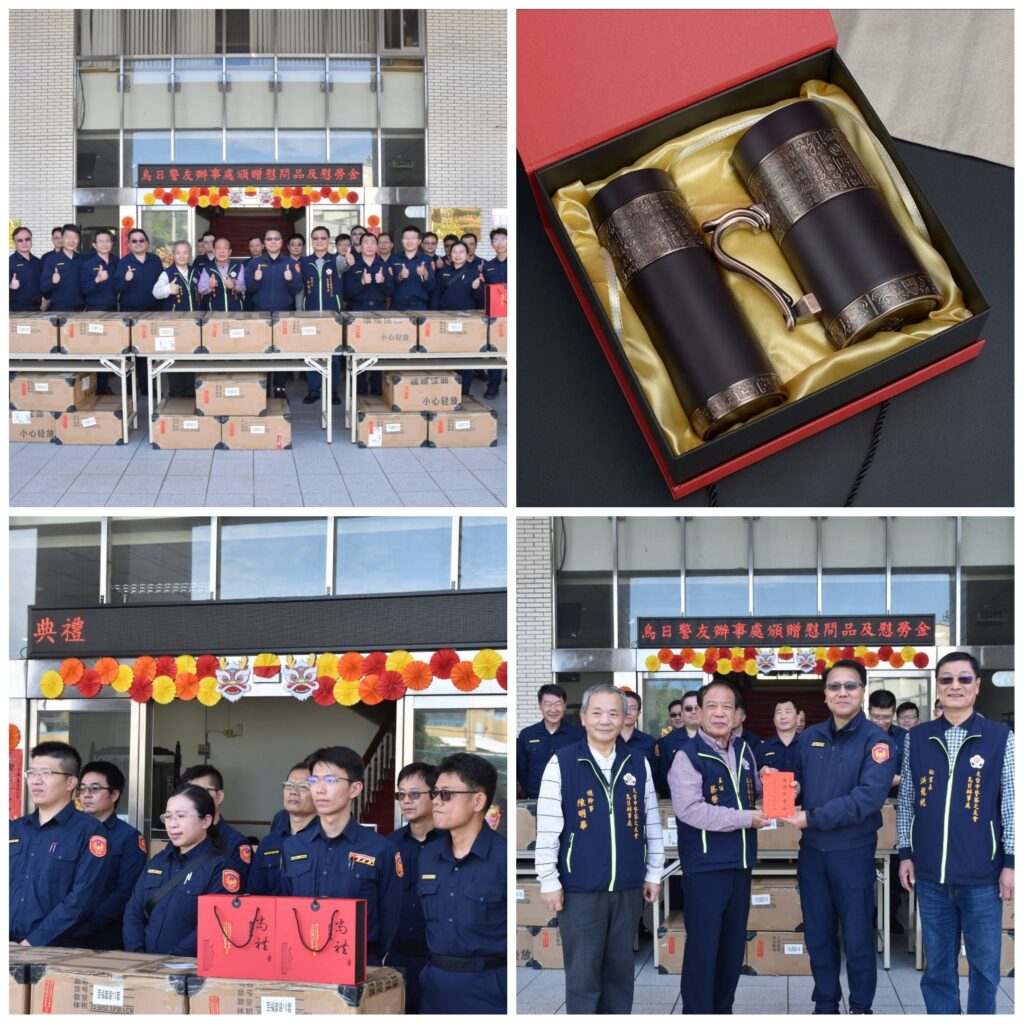臺中市大台中警察之友會烏日辦事處主任蔡榮昌表示,農曆春節是國人十分重視的傳統節日,也是家人溫馨團聚的時刻,烏日分局警察同仁犧牲陪伴家人過節的時間守護地方安全,無私奉獻的精神致上最高謝意。近期強烈大陸冷氣團來襲,低溫下探11度,不捨警察同仁頂著寒風在外執行勤務,於是致贈保溫杯,盼員警在寒冷冬天使用時備感溫暖。 烏日分局分局長尤啓南表示,感謝蔡主任百忙當中還送來滿滿的祝福,關懷及相挺員警,鼓舞士氣,以行動做烏日分局最堅強的後盾。今年加強重要節日安全維護工作期間,警方將全力維護治安以「治安平穩、交通順暢、民眾安心」為主軸,推動各項治、交安維護工作,讓民眾安心過個好年。