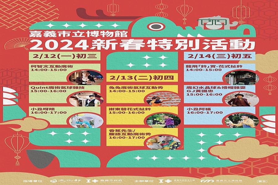 另「市立博物館」更於春節大年初三至初五,舉辦新春特別活動(https://pse.is/5km9g2 ),如互動魔術秀和民俗雜耍表演等,適合親子同樂共賞;國定古蹟嘉義城隍廟,也將在大年初三、初四上午,各贈送1500個「祥龍獻瑞」招財錢母吊飾,與信眾結緣;阿里山林業鐵路及文化資產管理處,特別推出搭乘「檜來嘉驛」送祈福小紅包、多肉植物等春節好禮活動(https://reurl.cc/lgYLME ),邀請全台民眾來嘉多玩幾天,歡樂過新年,好運龍總來。