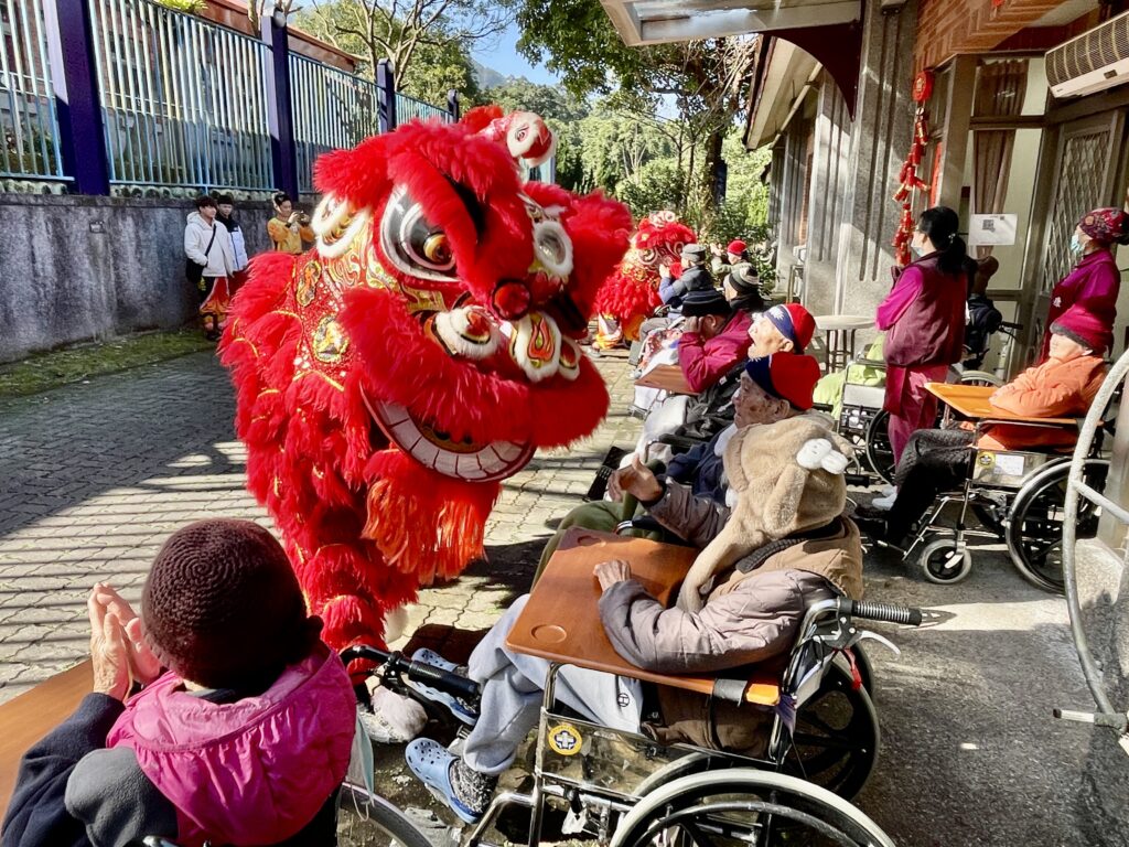 培德龍獅團由行政大樓出發,沿路敲鑼打鼓,繞行全家區並前進到各堂,住民長輩也都等著他們經過討喜氣,兩隻精神抖擻的紅獅子出現,吸引所有人的目光,它們舞動著矯健步伐,偶爾眨眨眼,偶爾張張嘴,調皮風趣地拜年,與每一位長輩親密互動,老人家們也摸獅頭露出開心的笑容,彼此互道恭喜新年快樂,還有長輩送上紅包討吉利。