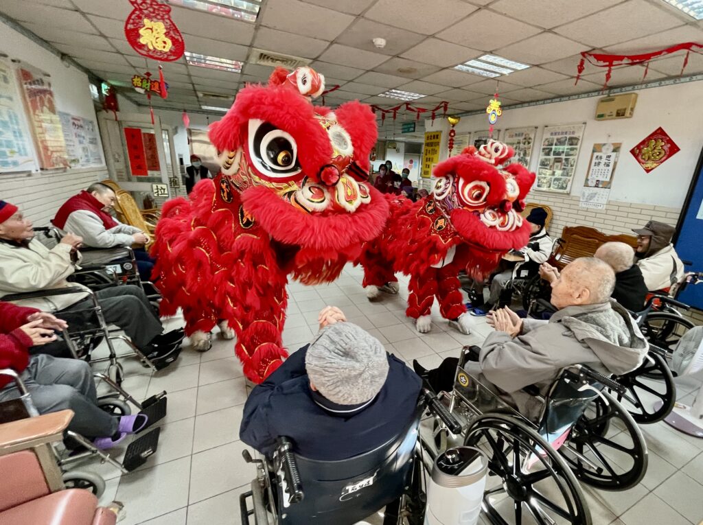 【記者邵祥輝/新北報導】臺灣培德龍獅團大年初二(11)日來到三峽台北榮家,兩頭喜氣的紅色舞獅到各堂跟住民長輩拜年,並在中正堂前廣場舞獅表演,帶來了濃濃的新年氣氛。