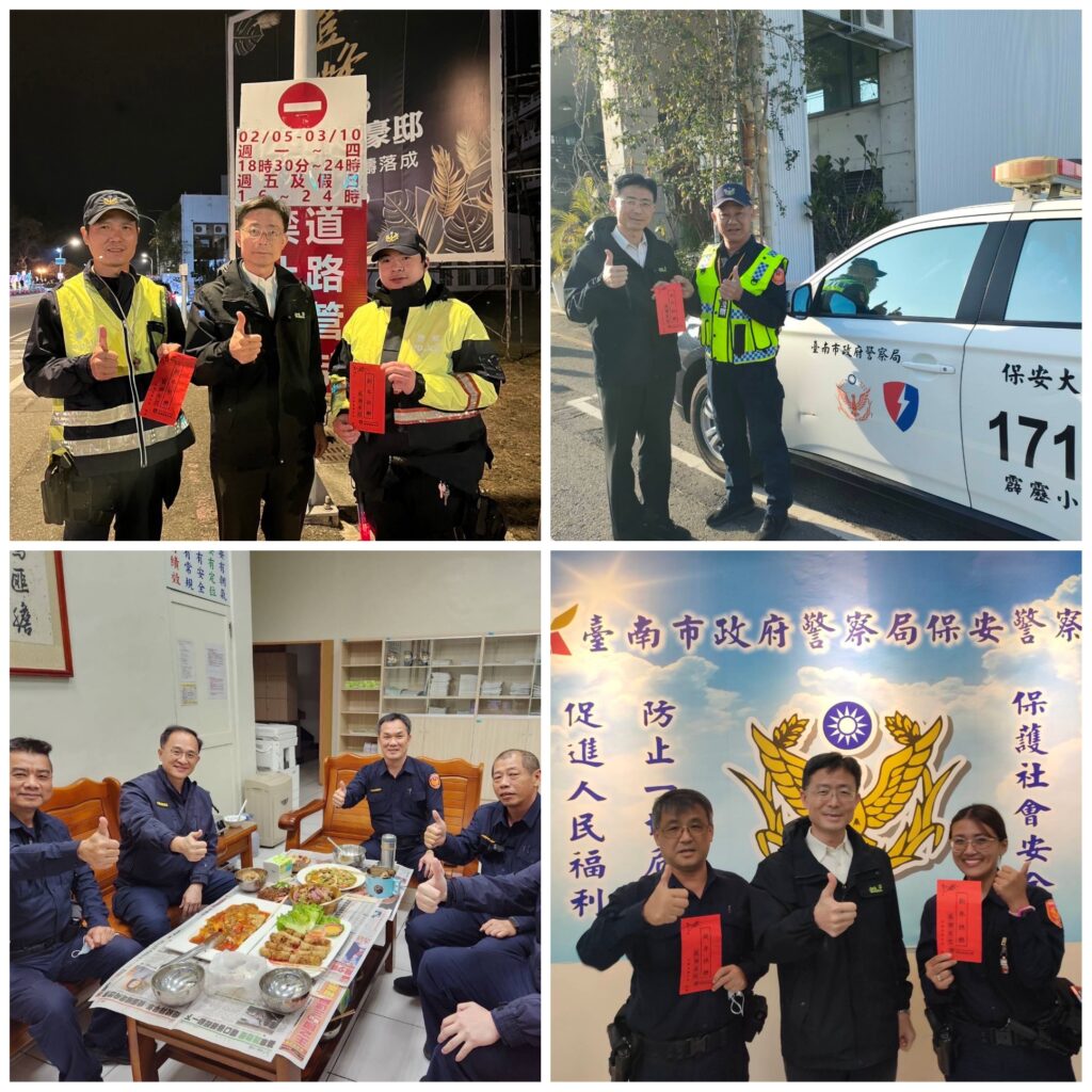 南警保大大隊長蔡宗昌特別肯定同仁春節期間的努力和貢獻,除夕夜除了頒贈加菜金,請副大隊長廖信智至第一中隊與同仁共進年夜飯外,也在年節期間親自前往各中隊、分隊駐地以及線上巡邏地點、2024台灣燈會、月津港燈節勤務崗位慰勞同仁,並送上年節紅包為同仁加油打氣,令保大同仁於犧牲與家人團聚無私奉獻之際,仍能享受年節氣氛,得到溫暖和支持。 南警保大大隊長蔡宗昌表示,感謝該大隊同仁不辭辛勞,夜以繼日地工作,不僅有效加強重要節日安全維護工作主軸之「治安平穩、交通順暢、民眾安心」各項勤務作為外,對於南市轄內重要刑案、重大活動之查緝維安,該大隊並備有訓練精良的特殊任務編組警力,隨時會同各警察單位妥處應變,可謂「春節假期治安不打烊」、「打擊犯罪全年無休」。最後,也提醒民眾外出旅遊注意安全,務必遵守交通等規則,配合所有員警、義交的指揮疏導,共同營造一個和諧、安全的社會環境。