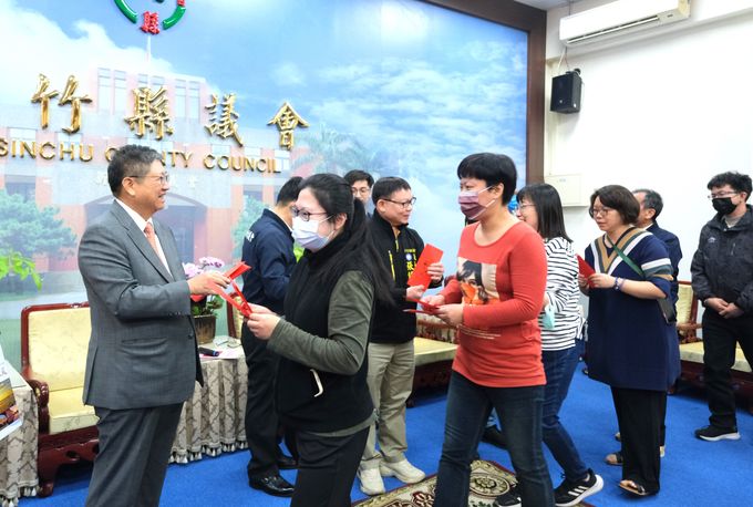 【記者彭慧婉/新竹報導】新竹縣政府及新竹縣議會今(15日)舉辦新春團拜,縣長楊文科、副縣長陳見賢、秘書長李安妤及立委徐欣瑩、縣議會議長張鎮榮、副議長王炳漢及議員等人皆出席,與縣府同仁互道恭喜,縣長及議長等人拱手拜年後,發放象徵好彩頭的開工紅包給議員、議會職員及縣府同仁,現場充滿歡樂氣氛。