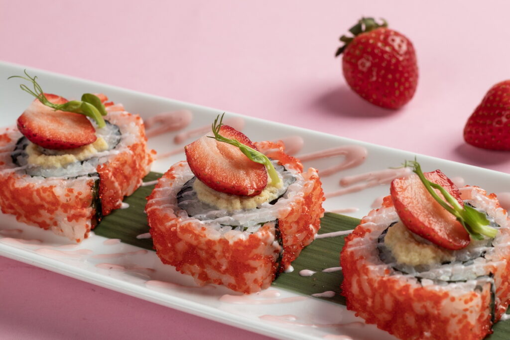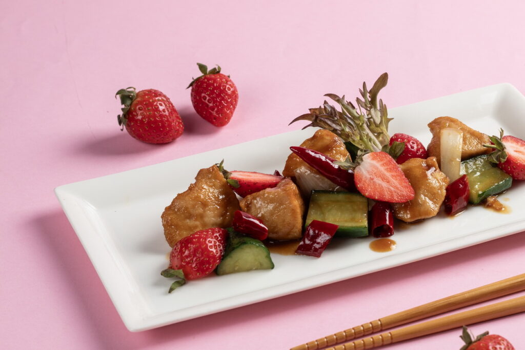 草莓控請注意囉!正值豔紅欲滴的草莓盛產季節,台南大員皇冠假日酒店元素餐廳特別推出【草莓來了】主題料理,您帶來一場粉粉嫩嫩的莓好食光。趕快約上情人或姊妹淘,一同享受這場美味盛宴。游輝杰主廚精於異國料理,巧妙運用台灣新鮮草莓的天然酸甜,為您帶來莓妙的味覺享受。「草莓泰式松阪豬」以泰國魚露、醬油和糖等調味料將松阪豬醃製入味,接著乾煎至金黃酥脆,肉質保持多汁,再淋上主廚特製的泰式靈魂醬汁,最後拌入新鮮草莓一同享用,令人讚不絕口。「草莓香辣雞丁」將雞丁炒至金黃鮮嫩,保有多汁的口感,加入一些辣椒、糖,調節出甜美與辣味的平衡,起鍋後將加入草莓與香辣的雞丁相互融合。還能製作成創意十足的「草莓捲壽司」,淋上草莓優格與新鮮草莓的妝點,讓原本的花壽司變成夢幻可口。「草莓香辣扇貝」將鮮嫩多汁的扇貝與草莓的甜美巧妙結合,並融入墨西哥酸辣醬汁,彼此交織出獨特的海鮮滋味,帶給您嶄新的味覺享受。還有「草莓泰式魷魚沙拉、草莓雞肉沙拉、草莓火腿華爾道夫、草莓蝦球、草莓雞肉唐揚」等異國料理,都讓人食欲大開。最引人期待的重頭戲莫過於「草莓糖葫蘆」,竟然在自助餐中也能夠品嚐到。新鮮草莓包裹在甜蜜的糖衣中,等待凝固後,形成了一層薄薄的甜蜜殼,增添了口感的豐富層次,讓人盡情享受它卡滋的美味!