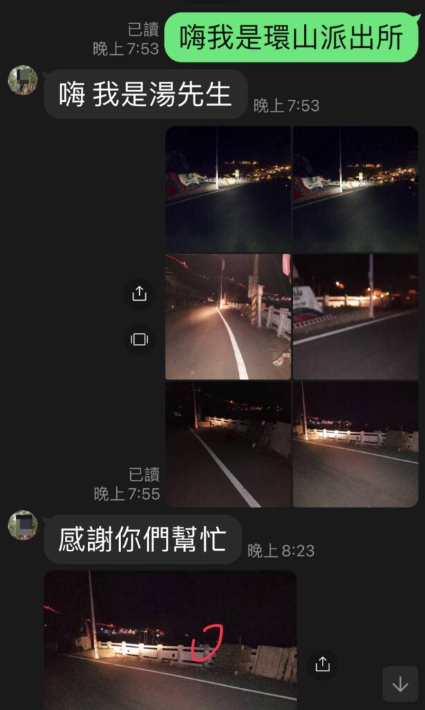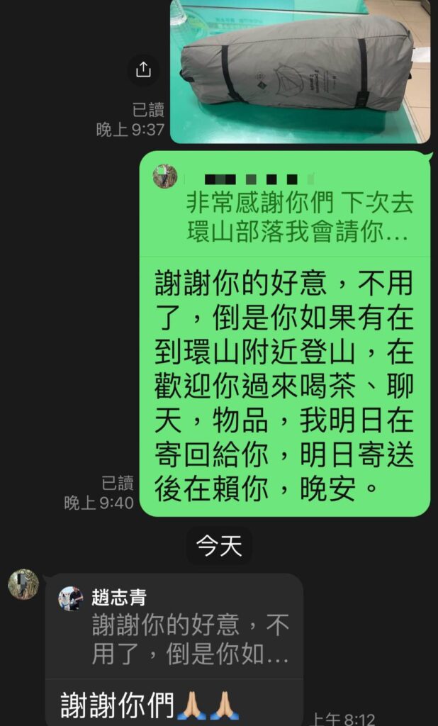 和平警分局環山派出所警員許朝焜獲報後立即趕赴湯男記憶中隨手放置營帳處找尋,惟沿路搜尋未果,回電給湯男再詳細回想可能放置地點,同日晚上6時許,熱心的所長趙志青及警員劉偉男獲悉上情後,以電話加湯男LINE通訊,並請以Google地圖標示可能放置地點(和平區中興路三段環山一巷),劉員騎乘機車沿路搜尋,終於尋獲遺落之營帳並拍照回傳給湯男確認後,將遺失物寄回失主,湯男對於員警暖心棄而不捨尋獲他的營帳,表達衷心感謝,並傳訊待下次去環山部落時會請熱心的員警喝飲料,員警連忙婉謝,並邀請可至派出所內休憩、聊天。
