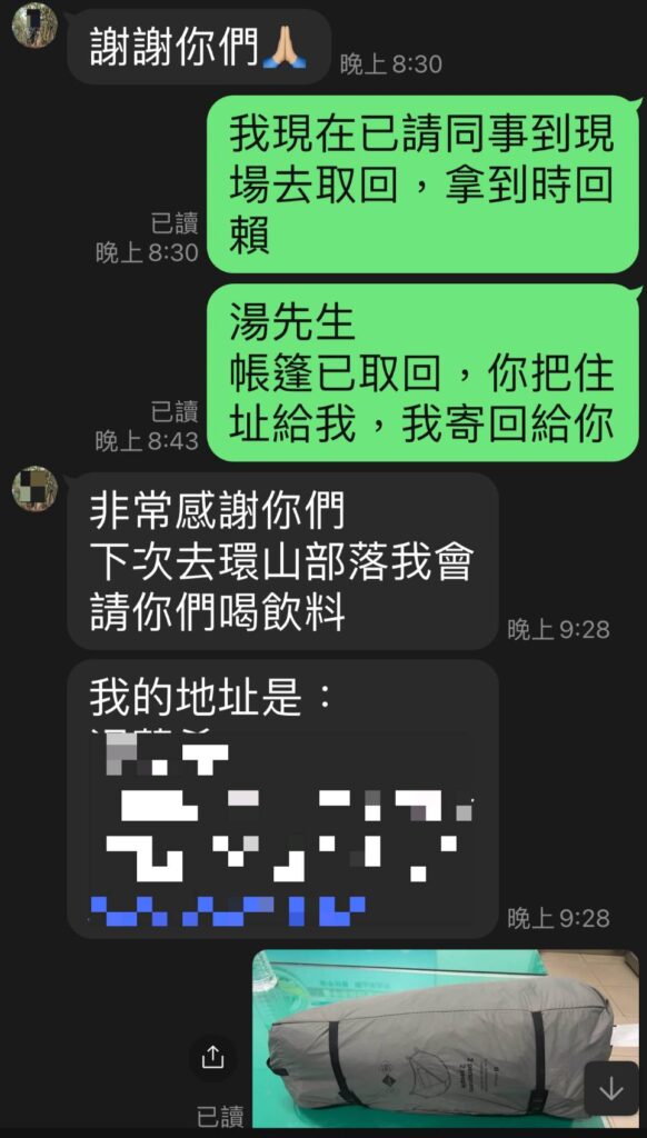 上山露營回家忘取營帳 和平暖警幫忙尋回並寄返失主真貼心