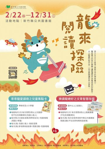 【記者彭慧婉/新竹報導】廣受大小讀者喜愛的「龍來探險閱讀集點活動」來囉!新竹縣公共圖書館今年度特別以生肖「龍」為主視覺,推出「乖乖龍愛讀冊-兒童集點卡」、「樂讀龍總好-智慧存摺」等集點活動,自2月22日起正式起跑,邀請大小愛書人共享書本樂趣,厚植閱讀力,打造竹縣遍地書香。