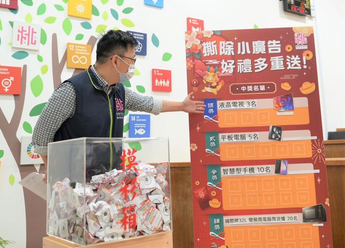 【記者彭慧婉/桃園報導】桃園環保局為鼓勵民眾協力撕除違規小廣告,今(21)日於環保行政園區2樓階梯教室舉行「撕小廣告換好禮」公開抽獎活動,共抽出38位得獎者,共有65吋液晶電視3台、平板電腦5台、智慧型手機10台及變頻微波爐20台等多項獎品,讓民眾透過做環保也能有「獎」不完的好禮可拿。