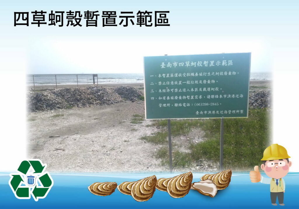 黃偉哲市長指出,市府農業局為了處理蚵殼問題,於111年7月規劃在臺南市安南區四草海岸設置四草蚵殼暫置示範區,面積達3580平方公尺,112年1月取得土地所有權,同年8月完成示範區設施設置工作,開放養蚵漁民將蚵殼運至該區暫置。農業局並於112年辦理蚵殼標售工作,以每噸200元價格售予得標廠商,112年已售出10.42公噸,所售出蚵殼交由台灣糖業公司的台糖生技材料廠製成蚵殼粉後,再交由下游廠商製成各式商品。