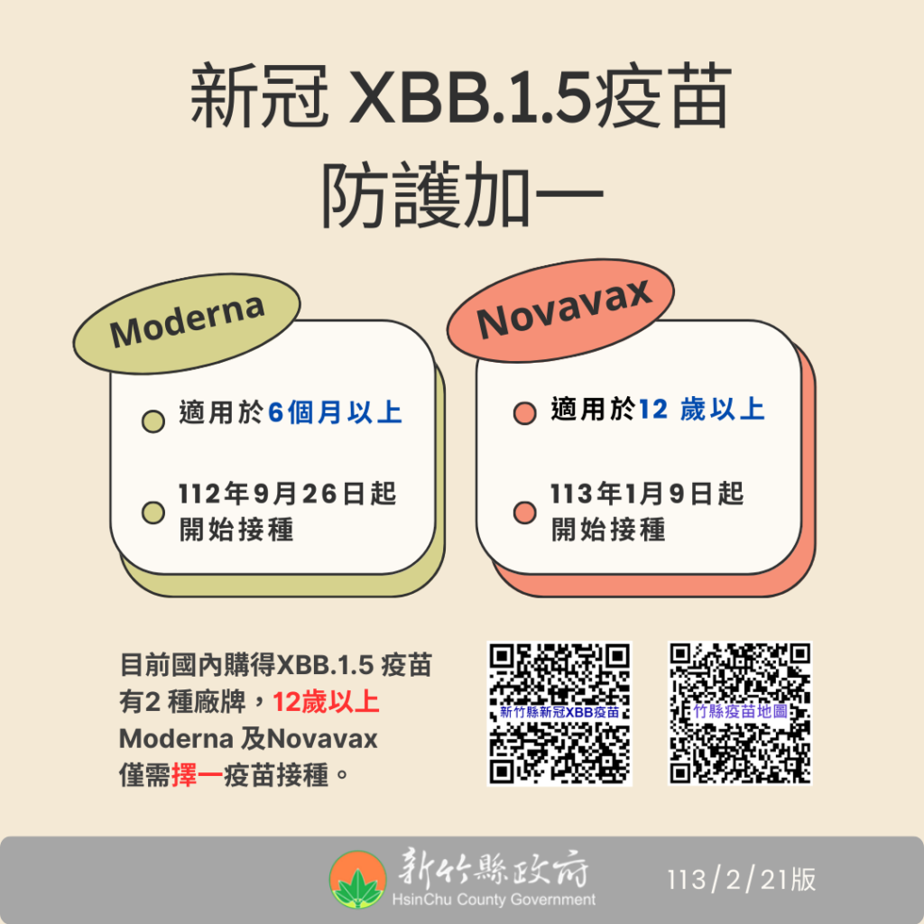 新竹縣政府衛生局指出,接種疫苗是預防疾病最經濟有效的方式,莫德納和Novavax兩種廠牌XBB疫苗均安全有效,12歲以上民眾可選擇一種廠牌接種,6個月以上至11歲兒童則接種莫德納XBB疫苗。接種疫苗後約需兩週才有保護力,建議民眾儘早接種COVID-19 XBB.1.5疫苗,以及時獲得保護力,尤其是0-4歲幼兒、65歲以上長者及慢性病患等高風險族群應趕快接種,降低併發重症及死亡的風險。