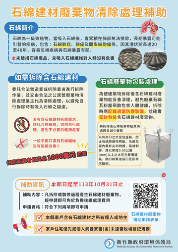 據環境部化學物質管理署遙測調查結果顯示,新竹縣迄今仍有多數家戶具有石綿建材,總重量預估為1萬3千公噸,而石綿清理費用每噸高達4.5萬至7萬元間,為減輕家戶負擔及維護縣民健康,新竹縣環保局向環境部爭取補助,以解決家戶石綿建材廢棄物之有害廢棄物清理困難問題。民眾可向竹縣環保局提出申請,經現勘核准後由民眾自行依法拆除,再由環保局通知清除廠商至家戶收運,送至處理機構處理。