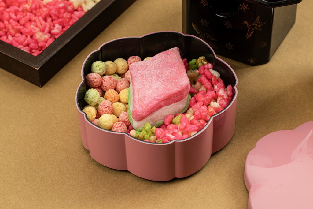 煉‧瓦餐廳郭曉芸副主廚精心設計的「女兒節散壽司禮盒」,共有兩層,每一個食材都富含祝福的寓意。上層是散壽司,蝦子代表長壽、蓮藕代表美好未來、黑豆與毛豆代表健康成長、勤奮工作,而玉子燒代表學業有成,再撒上櫻花鬆妝點,讓散壽司充滿春天氣息。下層放著雛霰是用米粒烘乾再炸,為黃、綠、白、粉四種色彩代表四季的和菓子。菱餅則是以粉、白、綠的三色年糕層層堆疊,再切成菱形,象徵為白雪融化後的綠色大地,以及桃花盛開的三月春季景致。禮盒附贈櫻花葡萄酒1組2瓶,可愛的杯酒,帶有濃郁的櫻花與果香氣息,酒內整朵可食用櫻花飛舞著,讓人少女心大噴發。精緻的雙層日式漆器盒盛滿了繽紛的櫻花感,讓「女兒節散壽司禮盒」成為這個春天最奢華、最具儀式感的伴手禮。