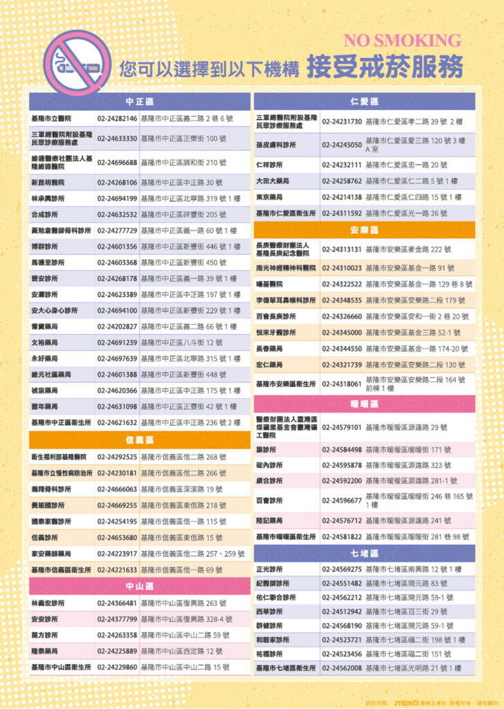 為了自己與家人的健康,基隆市衛生局邀請想戒菸的你(妳),可前往基隆市戒菸服務特約機構參加「為愛熄菸 戒菸就贏」活動,也可以多利用免費的戒菸專線0800-636363或Line@ ID:@tsh0800636363,讓專業的諮詢人員,與您共同討論如何克服生理戒斷症狀,幫助您挺過戒菸過程中的不適,戰勝菸癮,讓您珍愛家人,迎(贏)向健康。