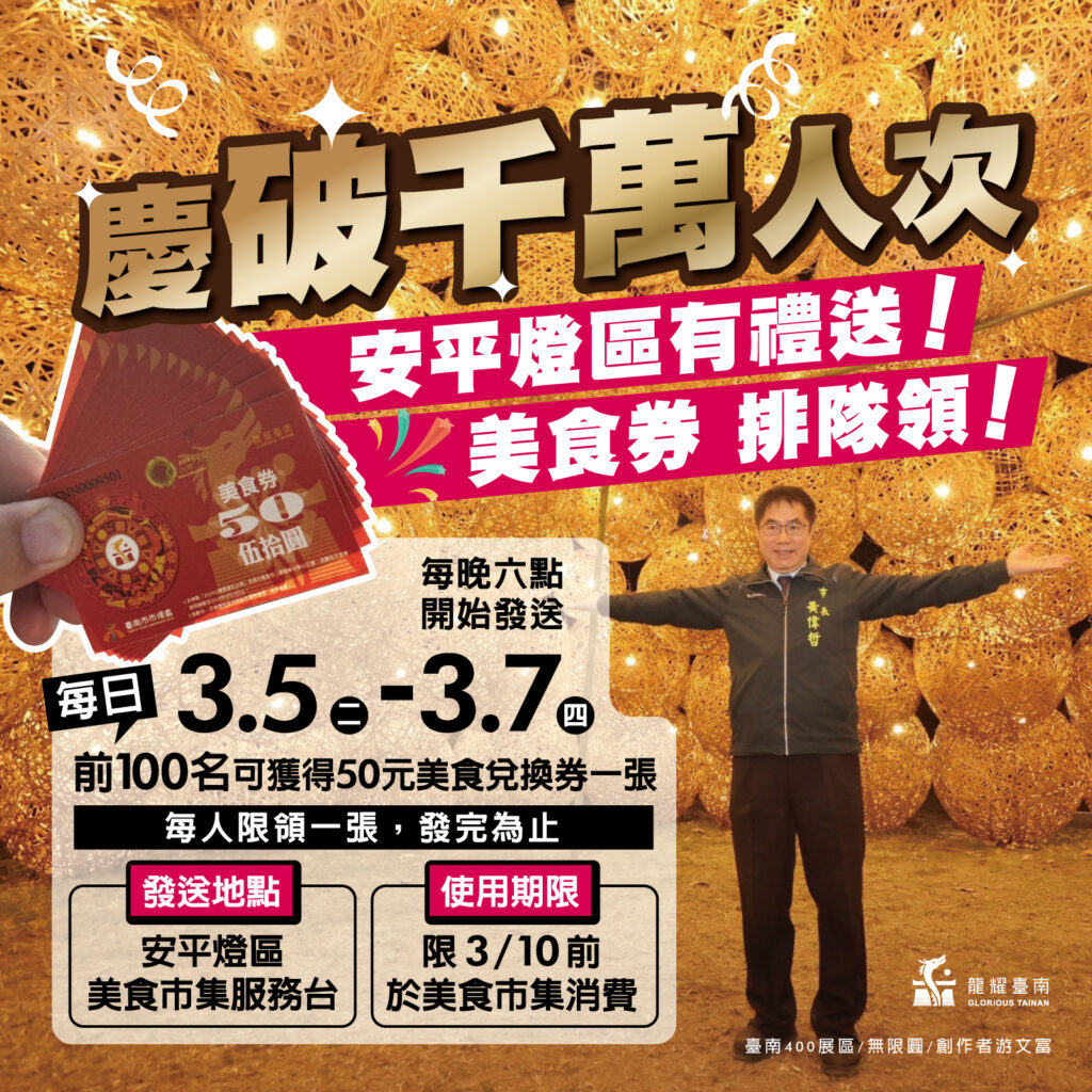 臺南市政府表示,為了讓遊客在賞燈之餘有更豐富的美食體驗,推出美食券優惠活動,面值50元,可馬上折抵,想帶朋友一同沉浸於絢爛花燈及垂涎美味的民眾,也可於113年3月10日前持美食券在安平及高鐵兩燈區使用,詳情請隨時關注市場處官網 (https://marketoffice.tainan.gov.tw/) 及臺南市市場巡禮臉書粉絲專頁 (www.facebook.com/TaiNanMarket/)。