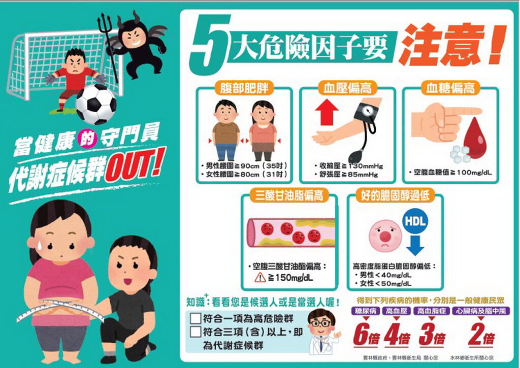 代謝症候群有5項危險因子, 以下5項中符合其中3項則代表有代謝症候群。