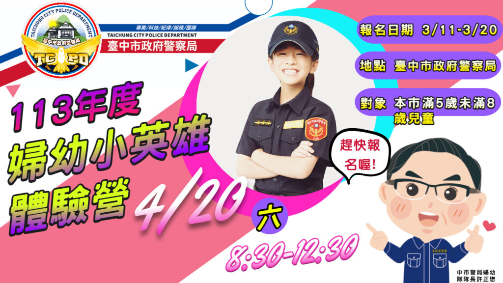 本次活動共召集60位設籍臺中市且滿5足歲至未滿8歲幸運的小英雄一起出任務,活動內容除讓小朋友換上帥氣爆表的警察制服,並模擬真實警察集合出勤方式,合作出任務拯救失蹤的小朋友劇情,讓小朋友更有情境與使命感。另外,本次活動特別安排中市警局超人氣的陳昱佑教官,教導小朋友基本防身術,透過動感活潑的音樂律動,無形中內化防身觀念。除實際操作防身術外,中市警婦幼隊亦精心於各任務關卡教導孩童身體隱私及自我保護意識等觀念,讓小警察們能從遊戲中學習,並有個快樂又難忘的體驗,活動最後各位勇敢的小英雄還可獲得婦幼隊專屬兒少自我保護L型造型資料夾及蠟筆等活動專屬紀念品。報名日期自3月11日9時起至20日24時止,預計於3月21日(星期四)公布抽籤中獎名單,報名方式請至「臺中市政府警察局婦幼警察隊」臉書粉絲專頁或官網查詢。各位家長們!能讓孩子放電又能學知識,趕快幫家裡的小英雄報名,準備好相機,留下寶貝們童年最美好的回憶吧!