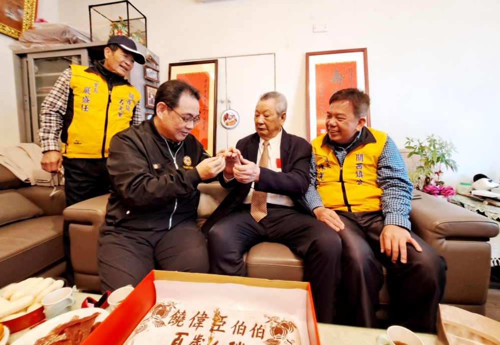 新竹榮民服務處處長鞠宗顯同新竹縣議員羅仕琦、關西鎮長陳光彩(關西鎮後備輔導中心主任)、石光里嚴盛任里長、榮欣志工等一行人,共同為百歲人瑞饒偉臣爺爺歡喜慶生,祝賀饒爺爺「福如東海,壽比南山」。