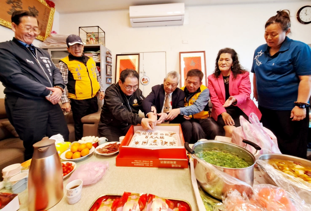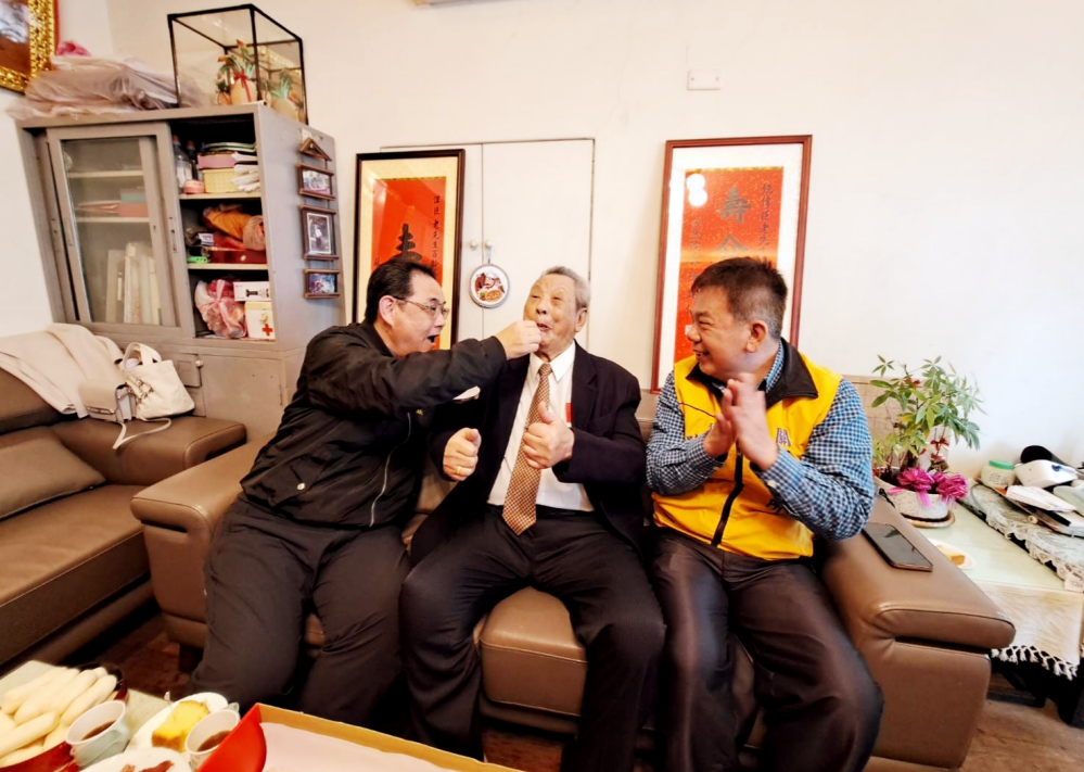 鞠處長贈總統、行政院院長祝賀壽屏及輔導會紀念金飾,同時精心準備特製伯伯大名的百歲蛋糕、壽桃及壽麵等祝壽禮,並親自替爺爺戴上紀念金戒子,大夥齊唱生日快樂歌,同聲祝福爺爺益壽延年、日日開心,饒爺爺喜笑顏開,感動不已,現場氛圍熱鬧溫馨並留下歡愉合影,饒媽媽還熱情招待大夥,並感謝榮服處貼心的關懷,陪伴爺爺歡度溫馨難忘的慶生會。