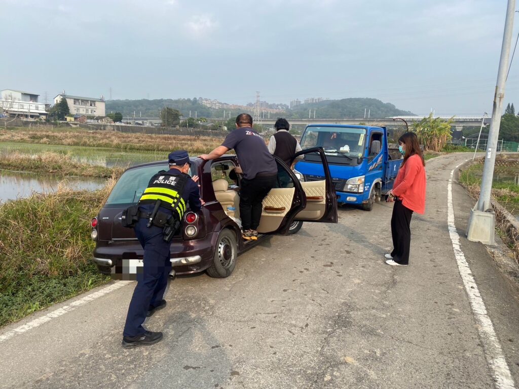 【記者彭維權/苗栗報導】苗栗縣警察局頭份分局斗坪派出所所長古雲泉、警員李正得執行巡邏勤務,行經頭份市上埔里產業道路時見有一名女子神情緊張站在路旁,立即上前關心,女子向警方表示所駕駛自小客車與耕耘機會車時輪胎不慎卡在水溝,動彈不得。員警見狀立即協調路過貨車司機共同協助脫困。