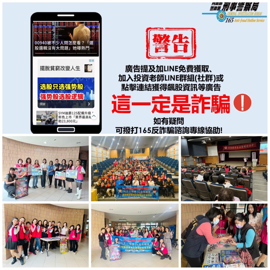 最近股市熱絡,詐騙集團亦跟上熱潮,冒名各投資名人如財信傳媒董事長謝金河,在臉書成立假粉專四處詐騙,猖獗程度連謝金河本人親自具名檢舉該廣告亦無法下架,對此本局反詐騙宣導團特別加強宣導,提醒民眾政府對於相關廣告管理辦法,均有規定投資廣告應揭露投資有「一定風險」、理財投資「有賺有賠」,所以網路上那些標榜「保證獲利」、「保證翻倍」或「穩賺不賠」一定都是非法詐騙,請大家千萬不要落入詐騙集團之陷阱。 本局提醒,多認識詐騙型態,可以增加警覺性,高獲利必定伴隨高風險,投資一定有賺有賠,請民眾慎選投資管道,民眾若有疑慮,請記得撥打警政署165反詐騙諮詢專線進行查證,並遵守反詐五不原則:「不接」陌生來電、「不聽」投資明牌、「不點」未知連結、「不傳」個人資料、「不信」可疑資訊,以免受騙上當。