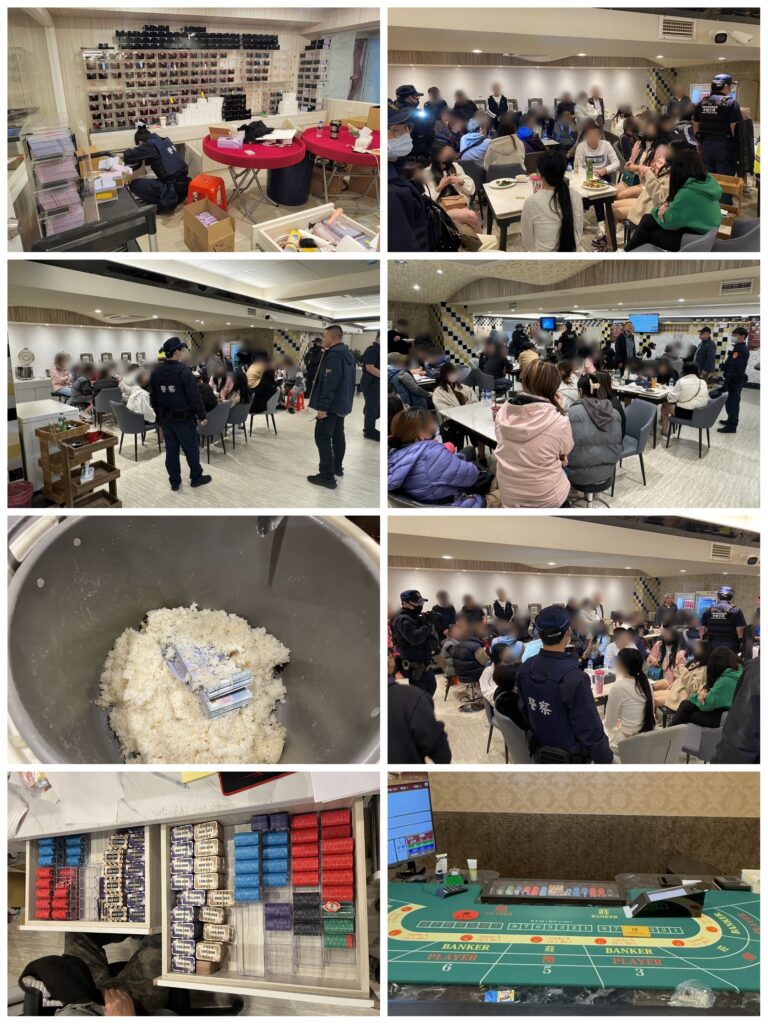 中壢警分局於112年曾破獲過該賭場,時隔1年後又發現種種疑似重新開張跡象,該分局督察組、偵查隊與興國派出所即組成專案小組,同時發動警勤區與刑責區共同探訪,布建查察。 經專案小組連月埋伏蒐證,掌握該處確有一再從事賭博行為後,即報請臺灣桃園地方檢察署指揮偵辦,並向臺灣桃園地方法院聲請核發搜索票獲准,於13日深夜見時機成熟,專案小組全員出動,持油壓破壞器破門攻堅,將此「死灰復燃」的百家樂職業賭場「再破獲」,員警破門時,其中賭場為了降低損失,竟把一疊20萬的千元鈔藏進飯鍋內,欲以白飯掩埋躲過警方查扣,但仍難逃警方法眼。 中壢警分局現場帶回賭場負責人、荷官及工作人員共12人,男、女賭客56人,查扣賭資新臺幣約100萬元、籌碼5億5000餘萬元,另查扣營業報表、電腦、監視器主機、高達43個的監視鏡頭、平板電腦、手機、發牌機6台等相關證物,全案訊後將張男等12人依刑法賭博罪移送桃園地檢署偵辦、賭客56人依社會秩序維護法裁處。 中壢警分局表示,未來除持續落實「清源專案3.0」及「社區警政再出發」等專案,並呼籲沉迷賭博易衍生相關問題,進而破壞家庭與社會治安。警方將持續嚴查究辦不法,以維護社會善良風俗,淨化治安環境,並彰顯警方打擊犯罪的決心。