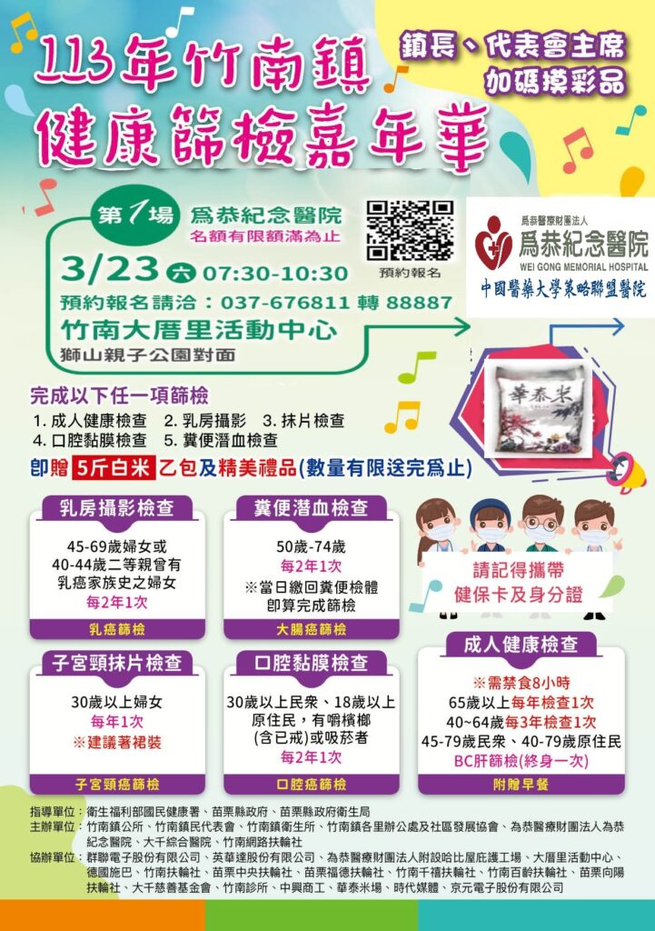 為恭紀念醫院攜手苗栗縣政府衛生局、竹南鎮衛生所、群聯電子股份有限公司、英華達股份有限公司、京元電子股份有限公司、德國施巴以及竹南25里里辦公處與社區發展協會,在竹南鎮大厝里活動中心舉辦「113年竹南鎮篩檢嘉年華」大型整合性篩檢活動,提供多項免費篩檢,包含成人健康檢查、BC肝篩檢、子宮頸抹片檢查、乳房攝影檢查、口腔黏膜檢查、糞便潛血檢查。