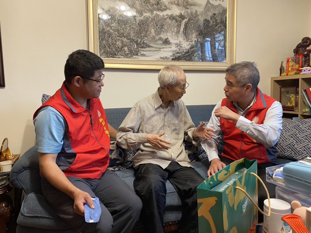 林處長分別探視了三位年逾93歲的榮民眷,和長輩們親切的閒話家常,言談中林處長鼓勵長輩們在安全許可下多做運動。陳姓前輩見林處長來訪,開心暢談以前軍中的經歷及退伍後工作生活。李姓前輩為依舊單身,林處長特別關心他的身體健康情況,李前輩頻表示,感謝榮服處多年來的關懷與協助;章姓前輩則是開心分享自己多年來養生之道,飼養一隻小狗作為陪伴,讓生活多些樂趣。
