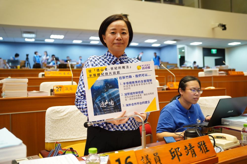 近日紀錄片「造山者-世紀的賭注」上映,邱靖雅表示,她看了之後很感動,也在紀錄片中看到楊文科的身影,她指出,半導體產業的GDP占比逐年升高,新竹縣作為半導體重鎮、許多家長都從事相關產業,她詢問紀錄片對新竹縣的影響?及讓學生對此有榮譽感的作法及努力?
