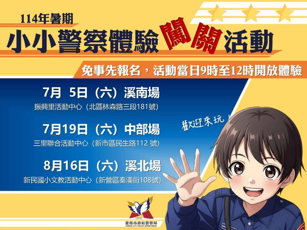 【記者蔡澤汝/台南報導】 為增進市民朋友犯罪預防及交通安全知能,運用多元創意宣導的方式拉近警民距離,讓安全觀念從小紮根,臺南市政府警察局針對4-10歲兒童,於114年暑期辦理3場「小小警察體驗闖關活動」。為擴大親子參與人數,分別在本市溪南(7月5日北區振興里活動中心)、中部(7月19日新市區三里活動中心)與溪北(8月16日新營區新民國小活動中心)地區各辦理1場次活動;有別於以往,今年特別與社區結合,深入社區活動中心舉辦,採開放式體驗闖關方式進行,無需事先報名,歡迎大家一起來玩。