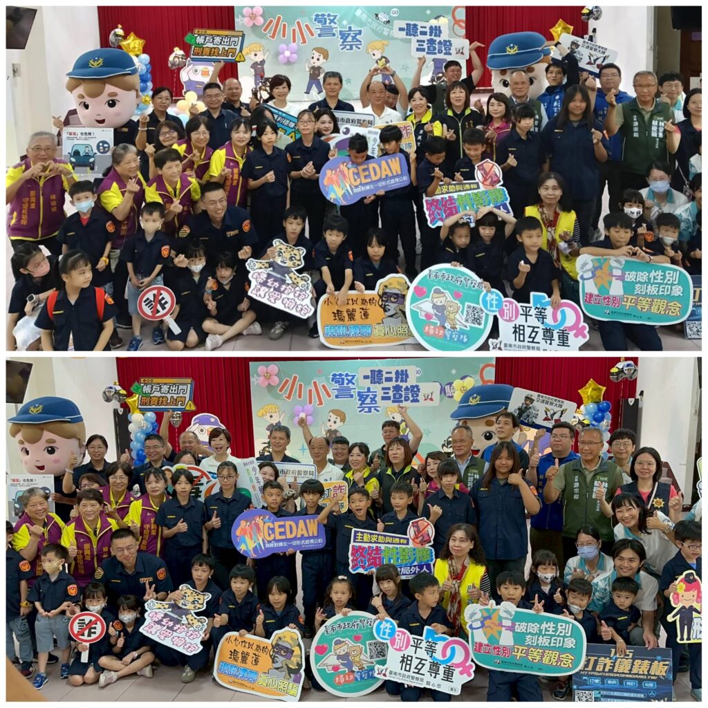 此外,局長親自向各位小小警察們交付任務,小孩子成長過程中最重要的是安全,無論是人身安全、交通安全,甚至是觀念的安全,要大家把本日學到的犯罪預防觀念帶回家中,落實在日常生活裡,除了要保護好自己外,更重要的是,每一位小朋友要成為家裡的「安全小天使」,提醒阿公阿嬤騎車時要遵守交通規則、遇到疑似詐騙電話,要趕快撥打165反詐騙專線或是110報案電話找警察協助,將反詐種子向下紮根,深入家庭之日常生活中,擴大宣導能量及成效。