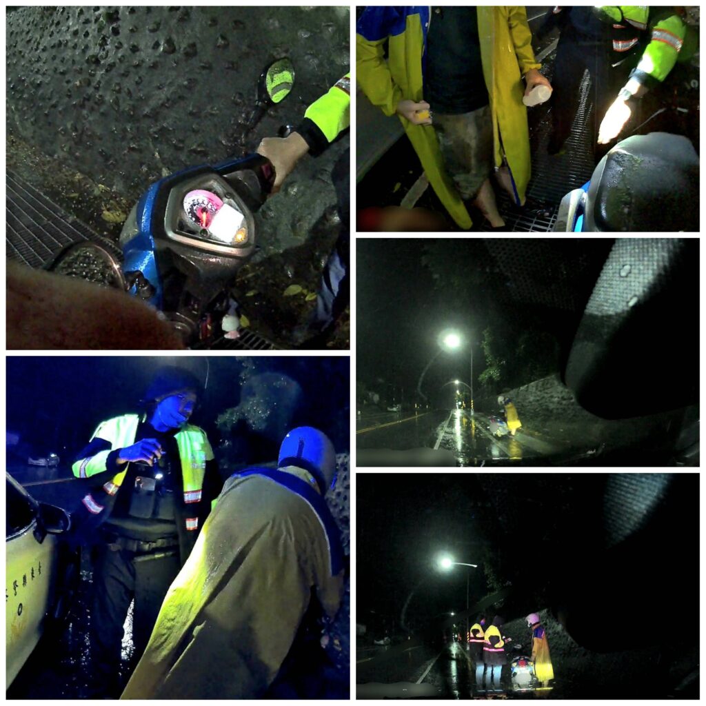 【記者蔡澤汝/台東報導】 6日晚間,受到「丹娜絲颱風」外圍環流影響,臺東縣縱谷地區風雨交加,一名林姓男子(95年次)上午從臺東市騎乘機車前往池上探訪友人,返程時卻因突發奇想將酒精倒入油箱,導致機車熄火拋錨,無助之際只好向警察求援。關山警察分局關山聯合所員警風雨中趕抵現場,協助將故障機車移至安全處,更貼心將林男載往火車站返家,展現颱風夜為民服務的熱忱精神。