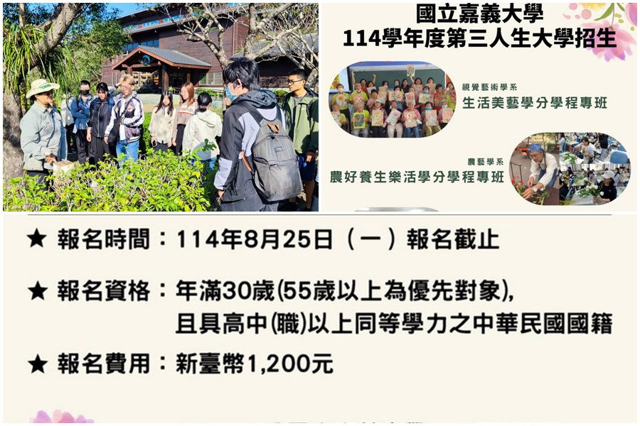 嘉義大學第三人生大學報名作業原訂於8月11日截止,考量近日南部地區豪大雨致報名不便,特延長線上與紙本報名時間至8月25日止。廣邀壯世代與資深公民參與「生活美藝」、「農好養生樂活」及「保健與樂活」三大主題課程,開啟熟齡學習新篇章,創造精彩的第三人生。