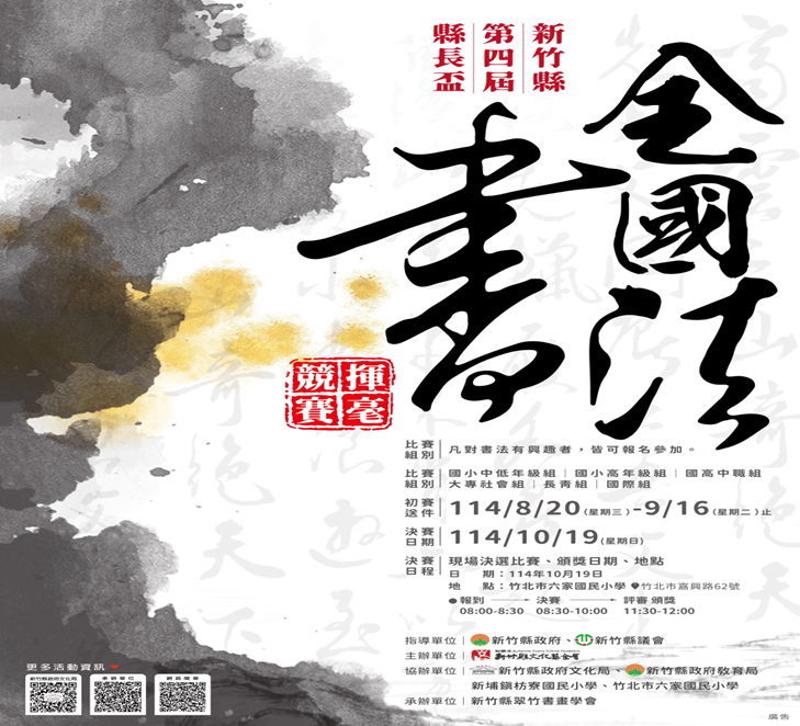 【記者彭慧婉/新竹報導】)為鼓勵全民參與書藝創作、弘揚中華書法精神,新竹縣文化基金會主辦的「2025新竹縣第四屆縣長盃全國書法揮毫競賽」即將登場。初賽徵件將自114年8月20日至9月16日止,決賽則預定於10月19日在竹北市六家國小舉行,總獎金及獎品高達50萬元,歡迎全國書法愛好者踴躍參加,一展筆墨風華。
