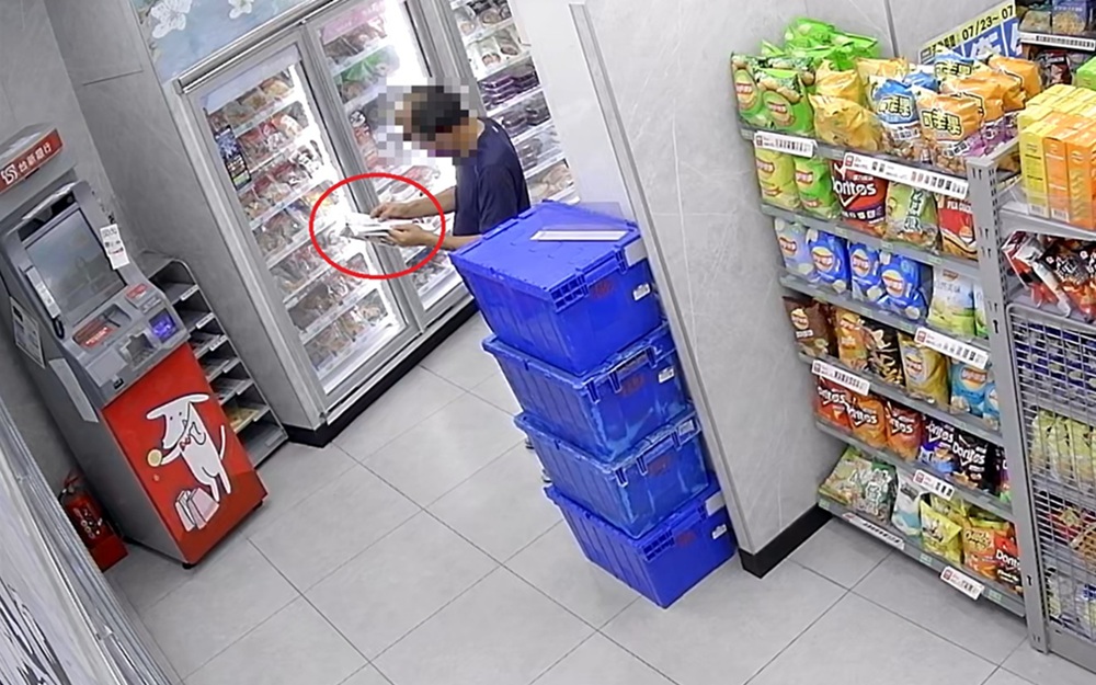 臺中市政府警察局第一分局公益派出所於114年7月27日接獲轄內美村路一段某全家超商通報,店長發現店內商品短少,調閱監視器竟見一名男子趁隙竊取四罐立頓奶綠及一本雜誌未結帳離去。隔日(28日)上午11時許,該男子竟穿著同一套衣服再度光顧,趁店員不注意將兩瓶蔬果汁與兩個冰淇淋藏入褲襠企圖離店,所幸店長眼尖攔下制止,並報警處理,員警陳煒淂、曾筱婷迅速到場將男子逮捕。